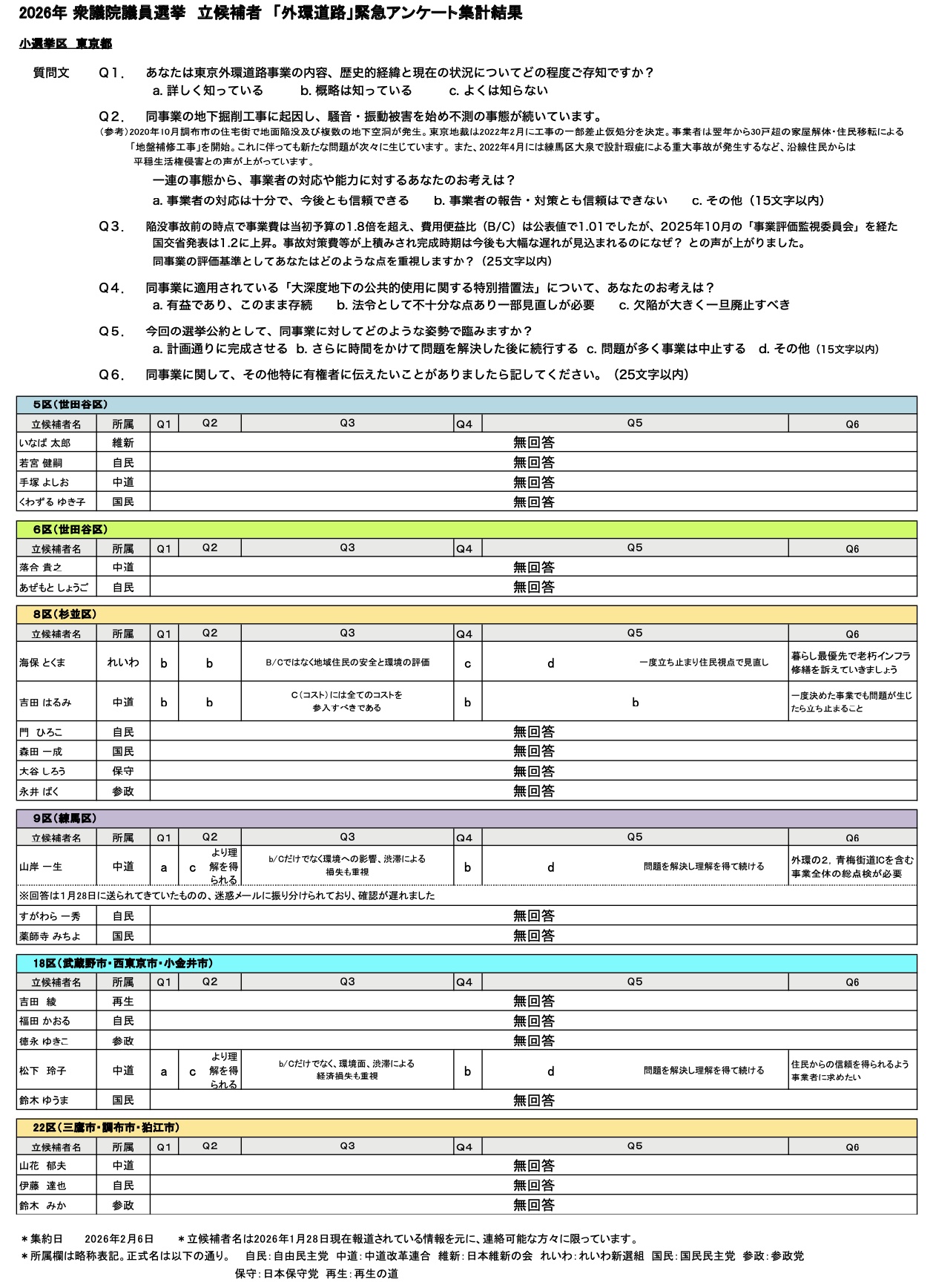 2026年 衆議院議員選挙 東京都選挙区立候補予定者 「外環道路」緊急アンケート